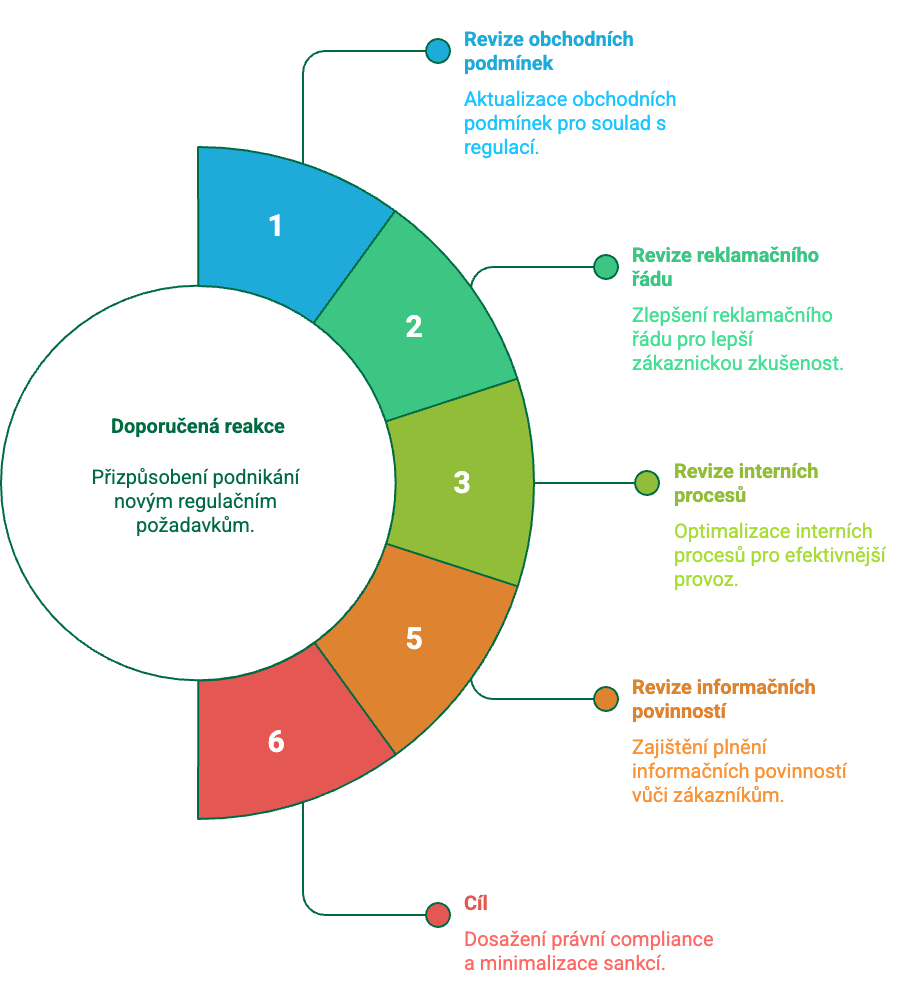 Jako Vaše advokátní kancelář Vám zajistíme včasnou a komplexní revizi obchodních podmínek. Pomůžeme Vám nastavit reklamační procesy, aby byly v souladu s novou legislativou, a přejdeme tak hrozícím sankcím ze strany dozorových orgánů.